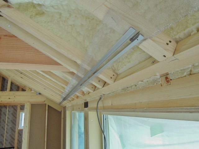 写真は吹抜2階天井の下地の状況です。メッシュを貼ってアルミのアングルで押さえているのが分かるでしょうか。