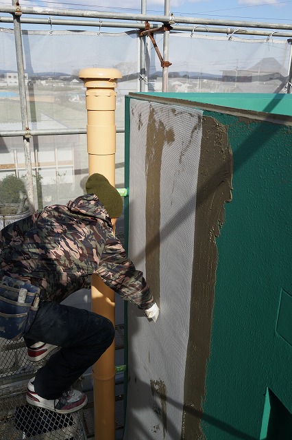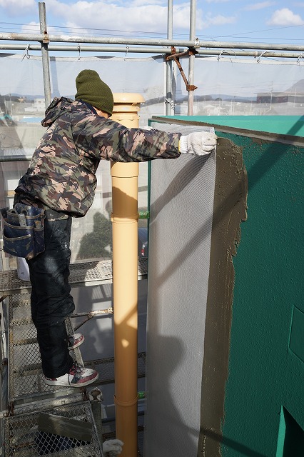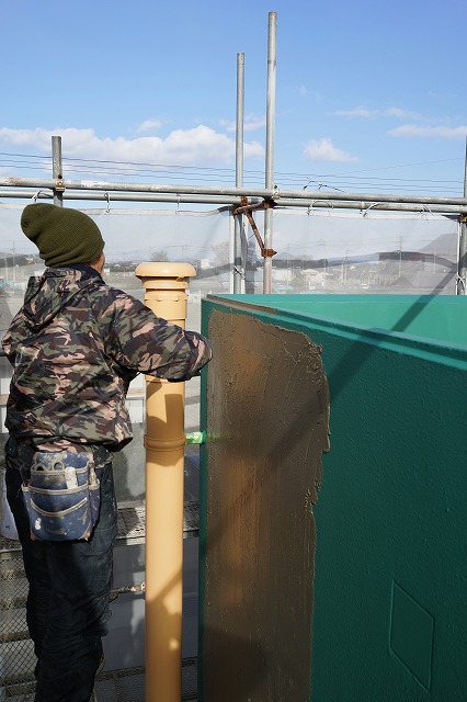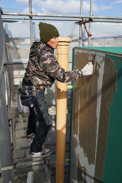 塗り防水が終了したので、樹脂モルタルを塗り込んでいます。