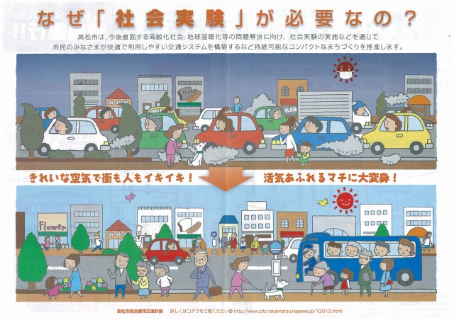 イラストで分かる事は、市内への車乗り込みを制限して自家用車をバスなどの公共交通機関に変える。