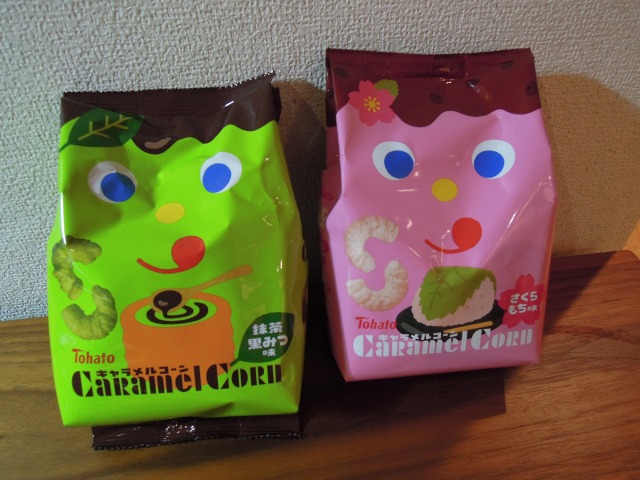 今回はキャラメルコーンの新味です、「さくらもち味」と「抹茶黒みつ味」。