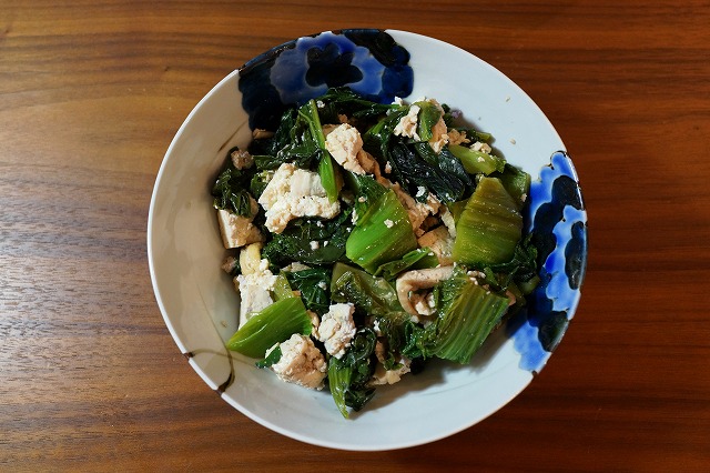 で、下茹でしたまんばをお揚げと一緒に炒めて、崩した豆腐と炒め煮します。