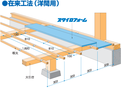 見えているのは根太という材料で、この隙間を断熱材で埋める。