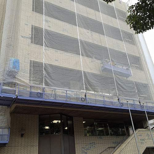 道路に面しているため、タイルの落下による事故を防ぐメッシュシートが貼られています。